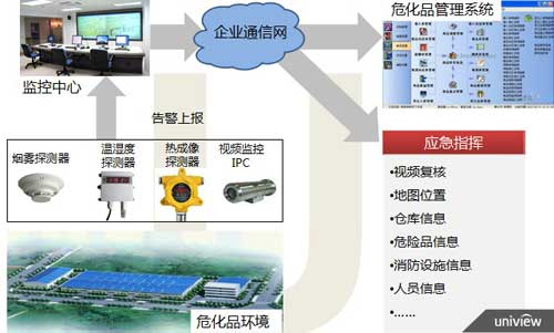 宇視可視化智慧安監方案基于開放的IMOS平臺,通過接入相關的智能環境探測器,報警聯動視頻,并將環境信息、視頻監控融合到企業安全生產應用系統和危險品監管中,可以應用在危化品的生產、運輸、倉儲、銷售等各個環節。