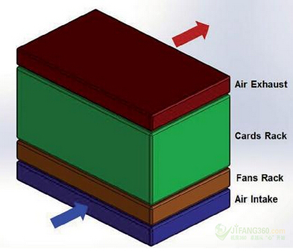 冷卻系統(tǒng)的組織,是為了使其符合機架供應商的標準。如圖1所示,其顯示了我們最終的設計草圖。進氣口是在前端的底部,而空氣的排出口是在頂部的背面或頂部。空氣流是從機架的底部流到頂部。最小空氣流量為每秒0.2立方米(m3/s)或420立方英尺每分鐘(cfm)。這一空氣流被定義了,以便該系統(tǒng)將能夠與現有的卡和機架向后兼容。機架的大小被固定在大約0.4 m x 0.44 m x 0.25 m (H x W x D),這意味著系統(tǒng)中的空氣每秒將被替換約四次。