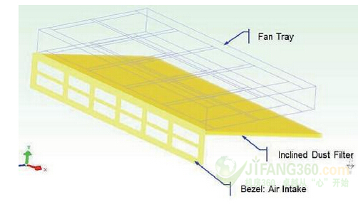 保持過濾器與風扇的平行是一大擁有其主要優(yōu)勢的選擇:過濾器的提取非常符合人體工程學。我們不得不增加系統(tǒng)高度至25毫米,同時將過濾器的尺寸被限制為系統(tǒng)的深度和寬度。增加表面應減少壓力下降,同時增加維修的次數。使用進氣口對角線來增加表面的空氣進入量。這個概念在空調系統(tǒng)中經常被使用。我們證實了這一定位,如圖3所示,其可以說是最好的模擬。