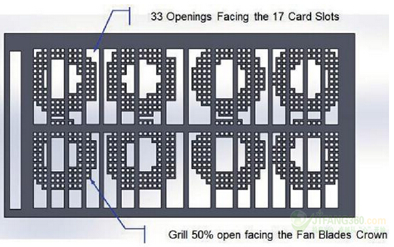 我們創(chuàng)建了一個多孔板,其具有兩個主要功能:1)在沒有插槽的地方停止氣流流動,以避免將空氣吹入封閉的EMI屏蔽物;2)在我們觀察到較高的氣流速度的區(qū)域減少氣流流動。這個多孔流體分配板(FDP),如圖9所示,必須是與該EMI屏蔽接觸。其將從而在入口處關閉,由卡機架的另一側已經關閉了蜂窩孔格封閉。因為板不需要維護,它可以連接到EMI屏蔽代替風扇機架。風扇和該多孔板之間的距離是至關重要的。氣流必須能夠被通過開口槽而不產生不可接受的壓力下降。